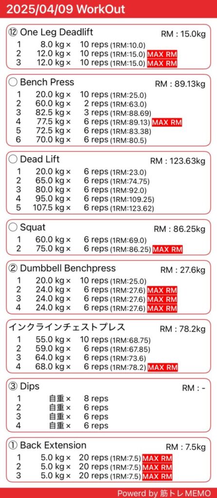 2025/03 | 9日 | 80kg x6rep | 87.5kg | ▲多忙 |