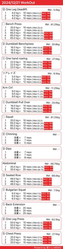 2024/12 | 9日 | 65kg x10rep | 80kg | |