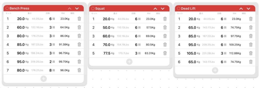 | ベンチプレス | スクワット | デッドリフト | |